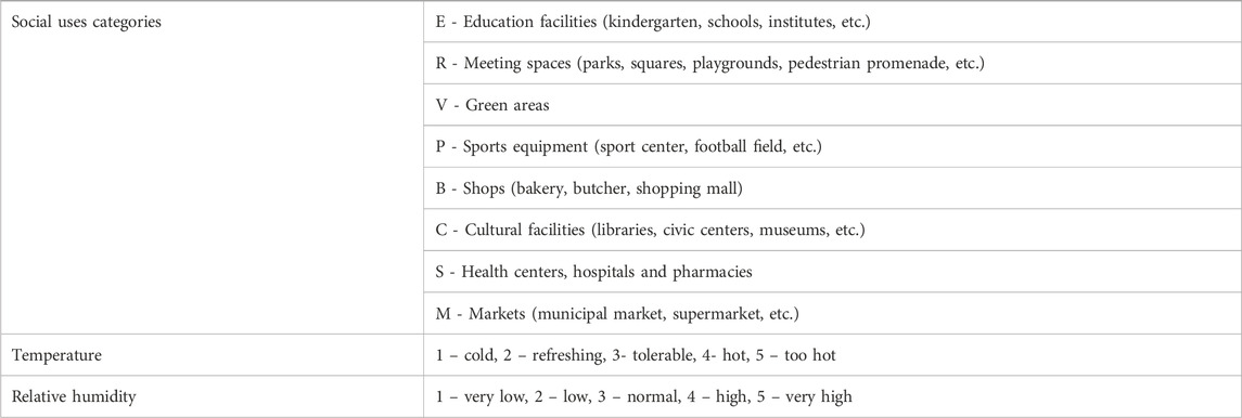 Table 1. Public spaces classification and temperature and relative humidity scales. Information provided to the participants regarding the classification of the public spaces uses and the perception scales with scores to express temperature and relative humidity.