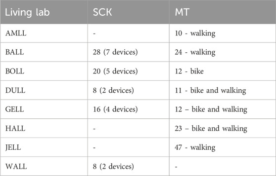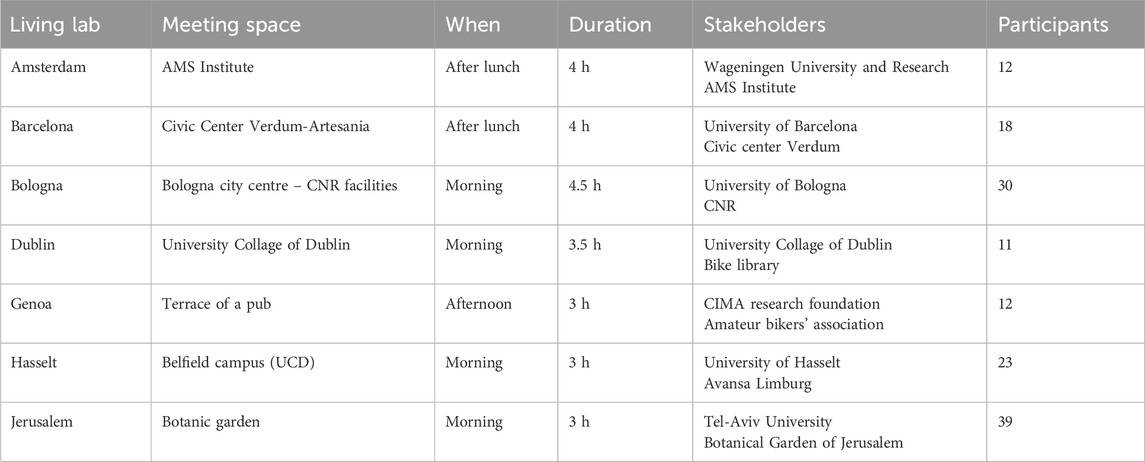 The activity was organized in collaboration between the research institutions of each LL and local stakeholders: a bike library, civic or scientific associations, or other public or private entities (e.g., a botanical garden). The work and meeting points took place in research centers, civic centers, the city center or recreative spaces (e.g., a pub). Participants were organized into groups to perform co-designed tours, either on foot (in 6 LLs) or by bicycle (in 4 LLs) with one or two MTs per group. Table 3 summarizes implementation details of the activity in each LL, including the stakeholders involved, the time and location of the activity, the number of participants, and the types and lengths of the routes chosen for taking measurements (walking or biking routes).