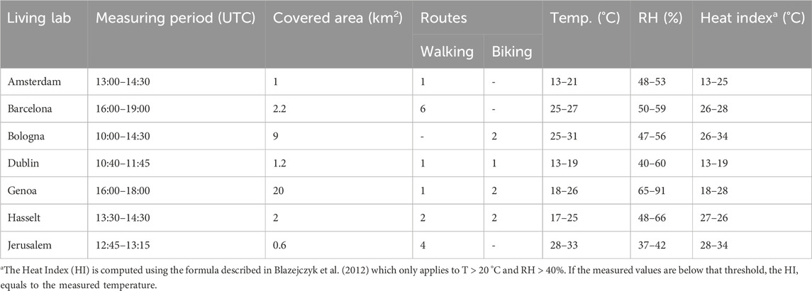 Different citizen science methodologies and tools were implemented during the ICD. The event design was led by the Barcelona LL of the University of Barcelona through a co-creative process carried out in an internal project workshop with the participation of all partners. This process resulted in the co-design of protocols for each activity, adaptable in their implementation details to the different local characteristics of the LLs. In line with participatory design approaches (Muki, 2015), researchers, local institutions, and citizens jointly defined the details of the experiments, including the selection of monitoring sites, the definition of walking or biking routes, and the means of transportation. For environmental monitoring, citizens deployed low-cost sensing technologies and received guidance on how to operate the devices, visualize the collected data, and understand how their contributions integrate into the project and improve local knowledge of climate change impacts. The two main instruments were the Smart Citizen Kit (SCK; Camprodon et al., 2019; Brattich et al., 2020), designed for fixed monitoring air pollution and meteorological variables, and the MeteoTracker (MT; Barbano et al., 2024; Loglisci et al., 2024), a portable mini-station for high-resolution mobile measurements of meteorological conditions. In parallel, citizens participated in perception-based monitoring, using qualitative scales to record expected and perceived thermal and humidity sensations across different urban spaces. Complementary activities were also conducted in some LLs, such as a Bioblitz (rapid biodiversity inventory involving volunteers and experts; Meeus et al., 2023) and a personal carbon footprint assessment (self-evaluation of individual contributions to greenhouse gas emissions), all of them being citizen science practices that combine data collection with awareness-raising. In addition, participants engaged in reflective practice sessions, where each group summarized the activity by identifying evidence, a concern, a proposal for neighborhood improvement, and an individual behavioral change they could implement in their lifestyle.