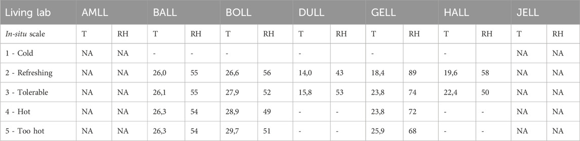 Table 5 presents, for each LL, the average temperature and humidity measured by participants at the visited sites, categorized according to the perceived temperature scale. For each perception level (1–5), the mean temperature was calculated using all measurements from locations where participants reported that specific value. Although all LLs used the same categories, the associated temperature records present notable divergences among cities (LLs). Bologna has the highest temperature values across all levels, and Dublin the lowest. None of the participants rated their thermal sensation in any of the spaces as ‘Cold’, as could be expected considering the season. In both Dublin and Hasselt, all reported sensations fall into ‘Refreshing’ and ‘Tolerable’ categories. A correspondence between thermal sensations and recorded temperatures can be observed, except in the case of Barcelona, where the temperature differences across perception levels are minimal as regards the humidity.