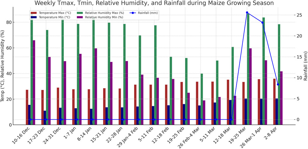 Figure 1. Weekly maximum and minimum temperature (°C), relative humidity (%), and rainfall (mm) recorded at the experimental site during the maize growing season.