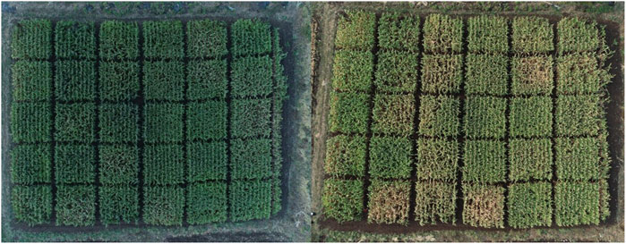 Figure 2. Aerial view of the experimental field captured with a UAV at the tasseling stage (left) and the dough stage (right).