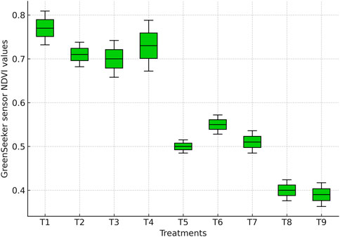 The lowest NDVI values were recorded when irrigation was applied only up to knee-high (T8: MSS 0.38; GreenSeeker 0.40) or withheld at all critical stages (T9: MSS 0.37; GreenSeeker 0.39), corresponding to a ∼50% reduction relative to T1 (p ≤ 0.05). These severe declines highlight the sensitivity of NDVI to prolonged water deficit, as limited vegetative growth and canopy senescence reduce near-infrared reflectance and increase red reflectance.