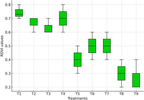 In contrast, RDVI declined significantly when irrigation was skipped at two consecutive stages (p ≤ 0.05). Treatments T5 (tasseling + silking: 0.38), T6 (tasseling + milky: 0.49), and T7 (silking + milky: 0.50) recorded 30%–45% lower RDVI compared with T1. These patterns are also evident in the RDVI values (Figure 5), where stressed treatments show clear reductions in canopy vigor compared with fully irrigated plots. Such declines reflect restricted canopy expansion, reduced leaf area, and limited light interception, which lower near-infrared reflectance relative to red reflectance, resulting in decreased RDVI values (Gao, 1996; Delegido et al., 2023).