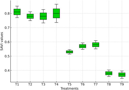 The lowest SAVI values were observed when irrigation was applied only up to the knee-high stage (T8: 0.37) or withheld at all critical stages (T9: 0.36), representing a ∼55% decline relative to T1 (p ≤ 0.05). These results illustrate the severe impact of prolonged water stress on canopy cover, as restricted vegetative growth and reduced leaf expansion limit light interception and NIR reflectance while enhancing red reflectance. This explains the sharp decline in SAVI under extreme stress. Overall, these findings underscore the sensitivity of SAVI to water availability and its reliability in distinguishing between moderate and severe stress conditions in maize.