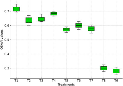 Figure 7. Boxplot showing OSAVI values derived from the multispectral sensor across irrigation treatments.