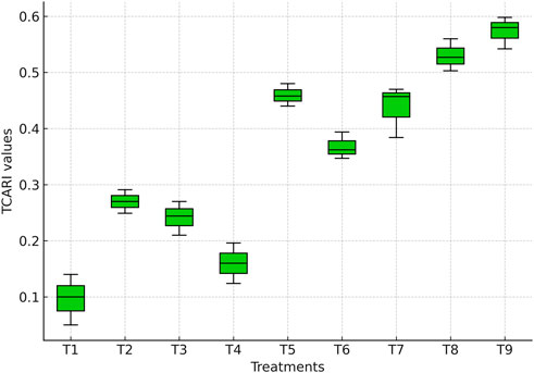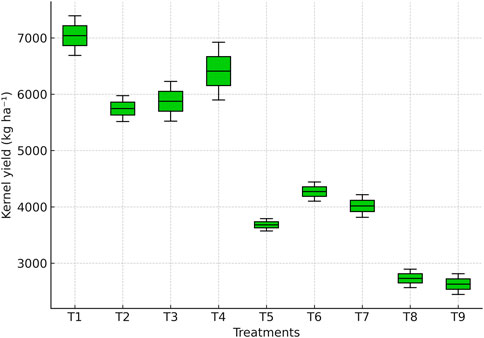 To complement the inferential analysis, supplementary visualizations were generated to aid interpretation. Boxplots were used to illustrate the distribution, variability, and treatment effects for kernel yield and vegetation indices, highlighting patterns and potential outliers. For clarity, significance groupings from DMRT were presented only in tables, while boxplots were reserved for visualizing distributions without additional lettering.
