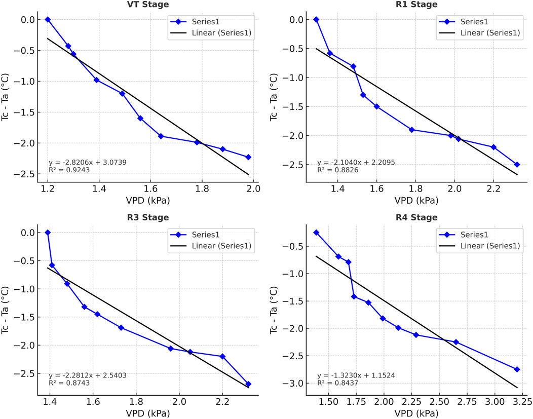 where VPD is the vapor pressure deficit, VPG is the vapor pressure gradient, and m and b are slope and intercept obtained from regression between Tc–Ta and VPD under well-watered plots.