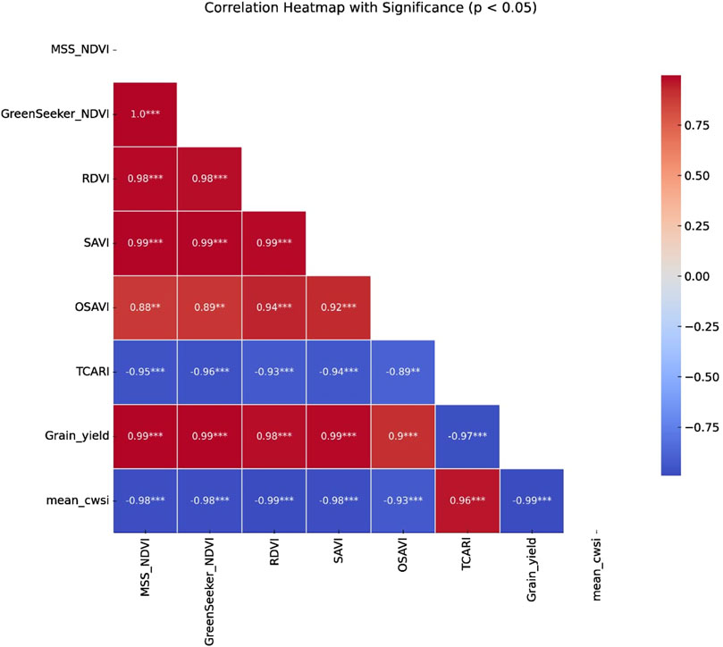 Discussion: UAV-based multispectral indices, when combined with ground-based CWSI, provide a robust framework for early stress detection and precision irrigation in maize. These results demonstrate the potential of remote sensing technologies to improve water-use efficiency and advance climate-smart agricultural practices in water-scarce regions.