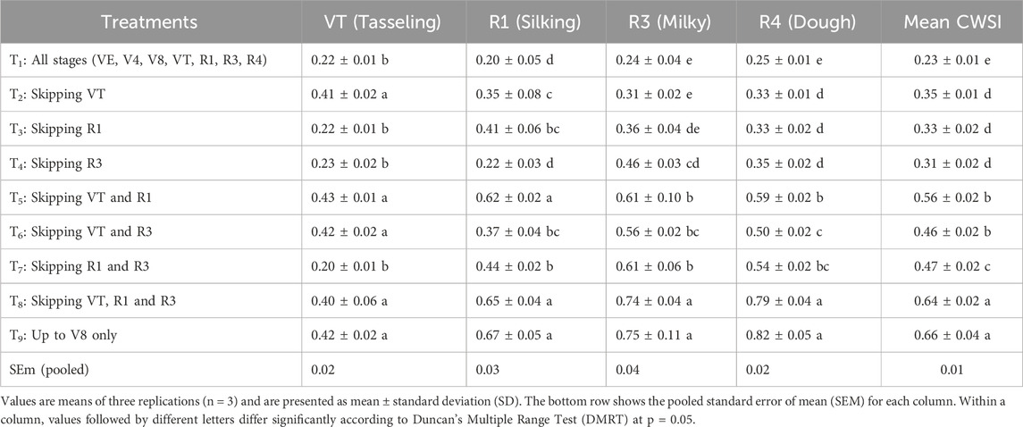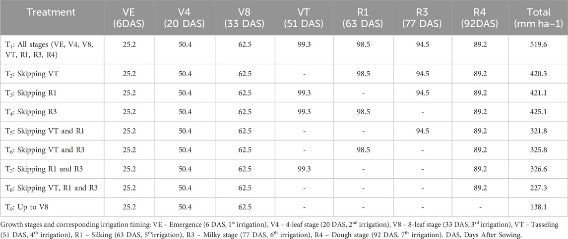 Table 1. Stage-wise irrigation schedule and total water applied (mm ha−1) for maize under different moisture stress treatments.