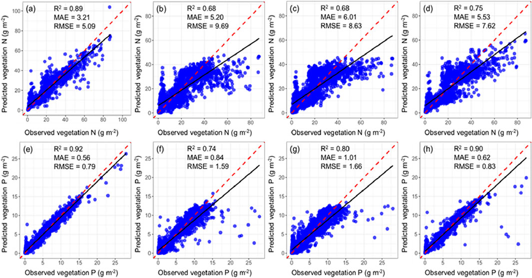 Figure 3. Prediction performance of four machine learning models for vegetation N and P (represented as a 1:1 linear scatter plots). (a) RF-VTN; (b) SVM-VTN; (c) GBRT-VTN; (d) GPR-VTN; (e) RF-VTP; (f) SVM-VTP; (g) GBRT-VTP; (h) GPR-VTP. The red dashed line represents the 1:1 line, and the black solid line represents the regression line. The same below.