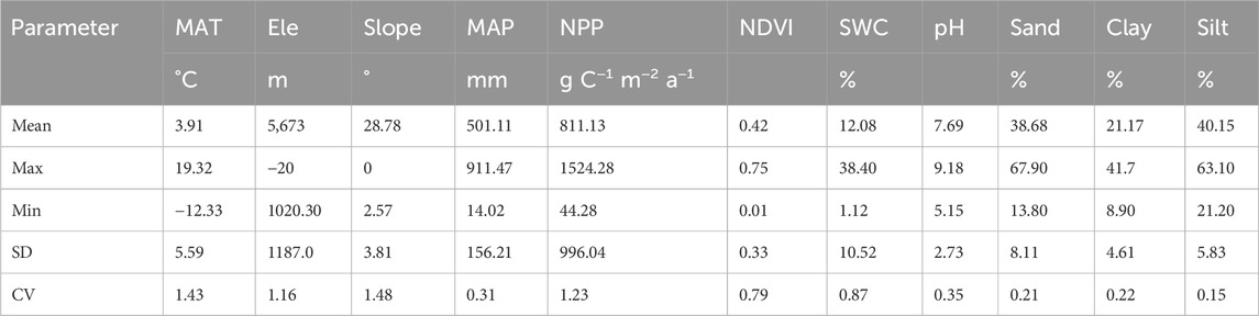 The normality of the data was tested using the Kolmogorov–Smirnov test. Non-normal variables were log-transformed prior to the following analyses (Tian et al., 2022). Subsequently, standard statistical functions were employed to compute the mean, minimum (Min), maximum (Max), standard deviation (SD), and coefficient of variation (CV) for each respective metric (Table 1).