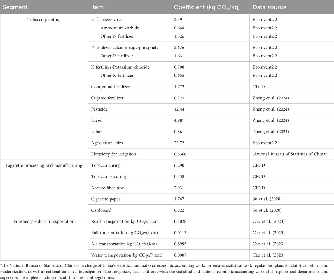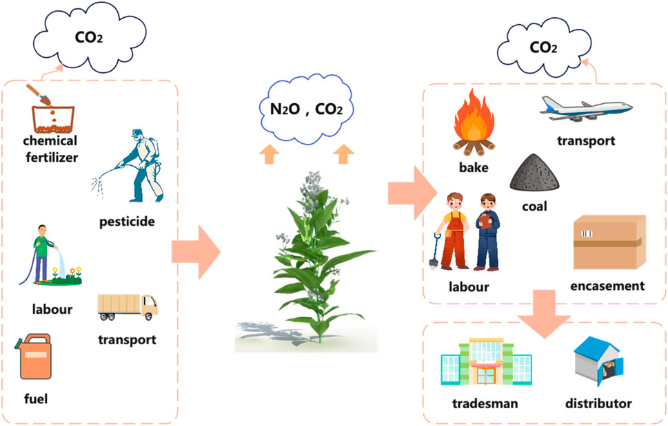 Tobacco, as one of the major cash crops in China, contributes significantly to the government’s fiscal revenue and farmers’ economic returns (Verguet et al., 2017; Alba-Reyes et al., 2024). According to the 2022 China Statistical Yearbook, its cultivation area reached 1,056,500 ha, realizing a total fiscal amount of 1,441.6 billion yuan. However, the full life cycle of the tobacco industry, covering the entire process from cultivation to processing, manufacturing and final transportation and sale, constitutes a non-negligible impact on climate change, as evidenced by the generation of approximately 84 million tons of carbon emissions per year (Zafeiridou et al., 2018; Ti et al., 2024). Among them, the cultivation of tobacco leaves, the production and processing of cigarettes, and the logistics and transportation of finished products have been identified as the main sources of carbon emissions. Although current studies have focused on the carbon footprint of the cigarette production stage, and relevant reports have been disclosed, it is worth noting that the amount of carbon emission contribution of the tobacco cultivation and subsequent transportation stage has not yet been fully assessed and emphasized, which, to a certain extent, has led to the underestimation of the total amount of carbon emissions of the entire tobacco industry chain (Hussain, 2014). Therefore, in order to more comprehensively and accurately assess the environmental impacts of the tobacco industry and formulate effective carbon emission reduction strategies, future research needs to further refine and strengthen the monitoring and analysis of carbon emissions at the tobacco planting and transportation stages.