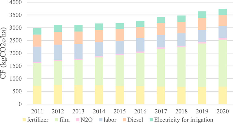 The composition of the tobacco carbon footprint is complex and varied, mainly including three stages: agricultural cultivation and production, cigarette processing and manufacturing, and transportation of finished products. Tobacco planting is the initial stage of the carbon footprint. This stage involves the processes of land cultivation, fertilization, irrigation, pest control and harvesting, all of which generate a certain amount of carbon emissions. In particular, the use of chemical fertilizers and pesticides not only increases the carbon stock in the soil, but also may enter water bodies through runoff and percolation, causing secondary pollution (Liu et al., 2014). Currently, several studies have shown that agricultural GHG emissions mainly originate from fertilizer use (Wang et al., 2017; Guo et al., 2022), in which carbon emissions caused by N fertilizer use accounted for more than half of all fertilizers, and at the same time, fertilizer use accounts for the highest percentage of the carbon footprint per unit area of tobacco during the planting stage. It is worth noting that compound fertilization is a feasible solution to address the decline in soil fertility under intensive farming conditions and may reduce greenhouse gas emissions. Compared with using mineral fertilizers alone, this solution not only increases crop yields but also reduces environmental risks (Abrahão et al., 2021). In China, tobacco farmers generally lack knowledge related to scientific fertilization, which leads to an increase in the carbon footprint of fertilizer use in tobacco production. In addition, when calculating the composition of the carbon footprint at the tobacco planting stage, this paper found that the GHG emissions from the use of agricultural films exceeded the impact of fertilizer application, and that China’s reliance on agricultural films is growing at an average rate of 2.31% per year. Now, the use of agricultural films is a necessary stage of tobacco planting cultivation in China. Although it improves the economic benefits of tobacco cultivation (Shan et al., 2022), the white pollution it brings poses a new challenge to environmental management during tobacco cultivation. Therefore, reducing the use of agricultural films is the key to reducing emissions from tobacco production.