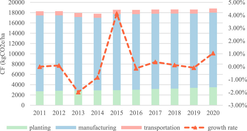 According to the calculation results, it can be found that during the period of 2011–2020, the average value of carbon footprint per hectare of planting area in the tobacco planting segment is about 3.06tCO2e/ha, while the overall trend is slowly rising, and the carbon footprint per unit area of tobacco planting area grows from 2.73tCO2e/ha in 2011 to 3.50tCO2e/ha in 2020. The average value of carbon footprint per unit area of primary curing and re-curing is about 13.19tCO2e/ha and 0.92tCO2e/ha, respectively, and the carbon footprint per unit area of the processing link decreases from 14.29tCO2e/ha in 2011 to 14.07tCO2e/ha in 2020. It can be found that the value of the carbon footprint of the tobacco curing and processing period is gradually decreasing, which may be originated from the fact that the improvement of technology level makes the efficiency of tobacco curing per unit area rise, this effectively reduces carbon emissions. Meanwhile, in the cigarette manufacturing box stage, the average carbon footprint per unit area is about 0.43tCO2e/ha, and shows a decreasing trend year by year. In the transportation stage, this paper refers to the study of Li et al. (2017), and sets the average transportation distance from cigarette material transportation to cigarette factory and from finished cigarette product transportation to distribution center to be 250km, then the average carbon footprint per unit area produced by road transportation, railroad transportation, air transportation and waterway transportation in the transportation stage is about 80.82 kgCO2e/ha, 8.88 kgCO2e/ha, 707.18 kgCO2e/ha and 6.84 kgCO2e/ha, respectively. it is obvious that air transportation has the highest carbon footprint per unit area in tobacco transportation, followed by road transportation, while railroad and waterway transportation have the lowest carbon footprint.