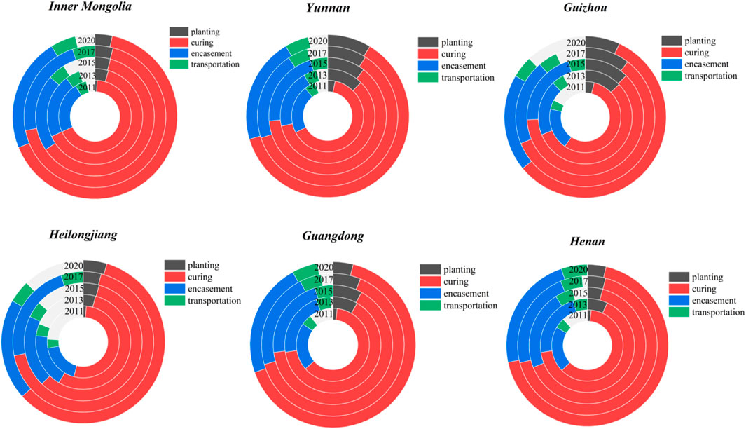 In Figure 6, it can be clearly observed that tobacco cultivation and its carbon footprint characteristics in Inner Mongolia, Yunnan Province, Guangdong Province and Heilongjiang Province show significant regional representation in terms of geographic distribution in China. Specifically, Yunnan Province has a more prominent carbon footprint in tobacco cultivation, while Heilongjiang and Guangdong provinces show higher carbon footprint levels in processing and manufacturing, and Inner Mongolia has the highest carbon footprint per unit of planted area in the whole industry chain. In order to understand these differences in depth, this paper then analyzes the carbon footprints of these four provinces in the key stages of planting, curing, crating and transportation. Meanwhile, in order to reveal the evolution trend of the carbon footprints in different segments between 2011 and 2020, this paper further analyzes the data of 2011, 2013, 2015, 2017 and 2020, and the results are shown in Figure 7. On the one hand, these six typical provinces all show higher GHG emissions in the curing stage, but with the economic growth and the continuous upgrading of curing technology, the carbon footprint in the curing stage shows a clear downward trend. On the other hand, it can be clearly found that Yunnan Province’s carbon footprint in the planting stage rises from 3% to 9% and accounts for the most among the four provinces, while Inner Mongolia’s planting stage has the smallest carbon footprint per unit area, which is related to the climatic characteristics of tobacco planting, it has higher requirements for light, water and soil conditions. Summarizing the results of the data analysis in Figure 7, it can be summarized that among the major tobacco growing regions in China, the primary curing and re-curing process of tobacco is the main contributor to GHG emissions, with its emissions accounting for about 75% of the total carbon footprint, and this process consumes a large amount of fossil energy. This is closely followed by the crating and planting process, while the transportation process has a relatively low carbon footprint. In terms of regional differences, in addition to the roasting stage, the Southwest region has the highest share of GHG emissions in the tobacco planting stage, with more than 16%; the Southeast region is the second highest, with 11% of GHG emissions in the planting stage; and the region north of the Yellow River, represented by Heilongjiang and Inner Mongolia, has the highest intensity of GHG emissions in the roasting stage due to the higher yield per unit of planted area, compared to the planting stage which has a GHG emissions accounted for a relatively small proportion. Furthermore, we have also found that in Henan, near the Yellow River, the characteristics of carbon emissions are similar to those in the areas north of the Yellow River.