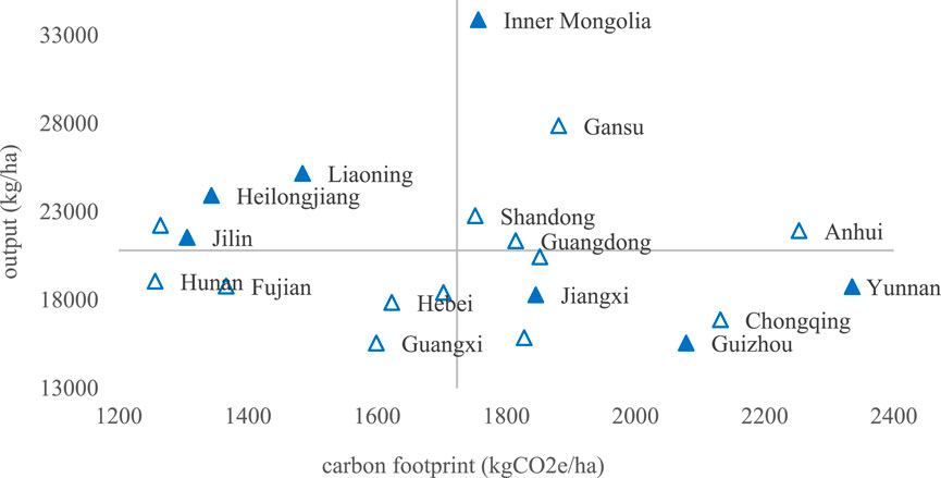 In view of this, how to balance the input and output with the intensity of greenhouse gas emissions is an urgent issue that needs to be solved nowadays. In this study, China’s tobacco-growing provinces are divided into four categories according to the degree of output and pollution emissions and inputs and outputs, respectively, and the input and output characteristics of different provinces in the planting process and their differences in GHG emission intensity are depicted in detail. The results show that the phenomenon of low outputs and high emissions as well as high inputs and low outputs in Yunnan, Guizhou, and Jiangxi, respectively. Yunnan- Guizhou region is a major tobacco-growing province. The income from tobacco cultivation accounts for a relatively large proportion of the province’s total income. By 2025, the operating income of the tobacco industry in Yunnan will account for approximately 13.8% of the province’s GDP. However, the current situation of high input and low output in tobacco cultivation within the province still needs further improvement. It can also be found from Figures 7, 8 that the yield per unit area in Yunnan region is relatively low, but the total carbon footprint per unit area is relatively high, indicating that there is considerable waste throughout the entire life cycle of tobacco. At the same time, tobacco revenue accounts for a relatively large proportion in this region. However, high carbon emissions have led to an increase in the local government’s carbon reduction costs. Therefore, both the production technology and the baking technology in this region need to be further improved. The phenomenon was found to be due to the accelerated pace of urbanization and the shift of tobacco growing areas to more remote mountainous regions, resulting in low penetration of tobacco growing machinery and higher labor costs (Zheng et al., 2024). Therefore, the tobacco planting strategy should be adjusted to this region to ensure the sustainable development and profitability of the tobacco industry from an economic point of view.