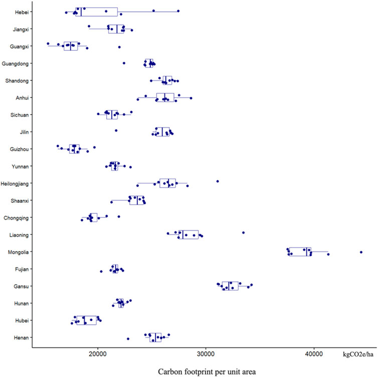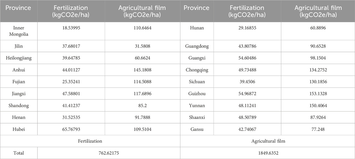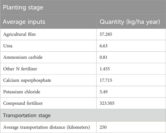 Currently, the LCA methodology is widely used as a product carbon footprint analysis tool to evaluate the entire life cycle of a product, process or activity from the production and processing of raw materials to the production, transportation, use and final disposal of the product (Baumann and Rydberg, 1994). It was found that the method analyzes the results in a targeted manner and the results are relatively more reliable (Zhang et al., 2020). In existing studies, it has become a mainstream trend to carry out agricultural carbon footprint accounting based on the LCA methodology, and it is crucial to carry out region-specific carbon emission studies in order to strengthen emission reduction and formulate relevant policies. Abrahão et al. (2017) and Abrahão et al. (2021) used LCA to quantify the carbon footprints of agricultural crops under different farming systems in Spain, and determined that nitrogen fertilizer is the main source of carbon emissions from crop production, and that controlling nitrogen fertilizer inputs can effectively reduce the carbon footprints of agriculture. Zheng et al. (2024) analyzed the temporal changes in the carbon footprints of different activities of China’s tobacco production chain from 2004 to 2017 using LCA, and revealed its composition and main influencing factors.