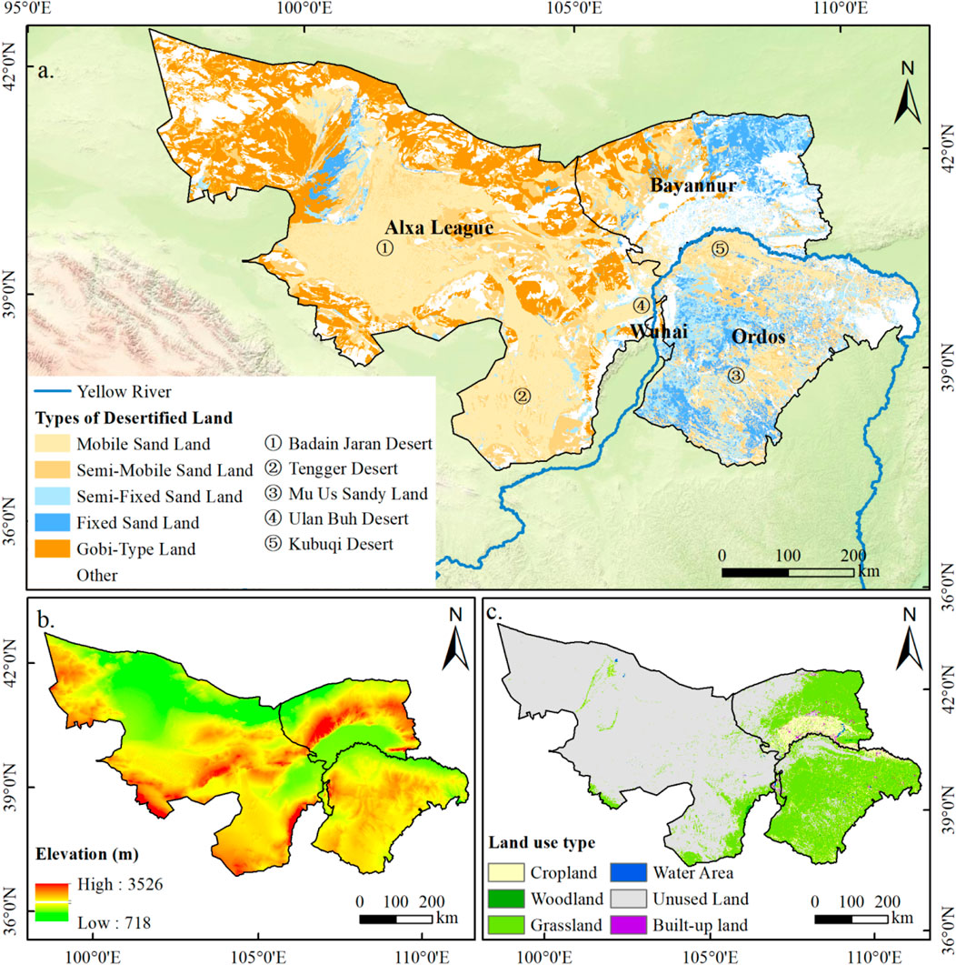 Figure 1. The location of the study area. (a) Distribution of desertified land types, (b) distribution of elevation, (c) distribution of land use/cover in 2010.