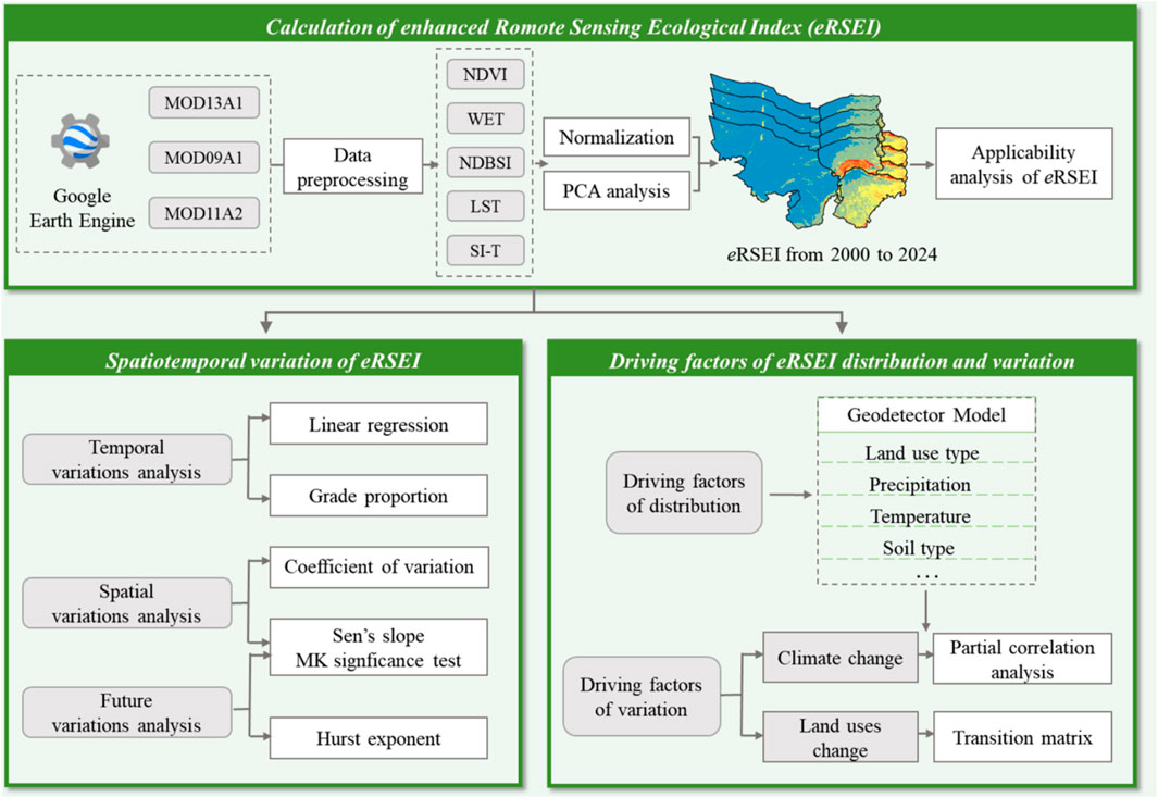 Hu and Xu, 2018 proposed the remote sensing ecological index (RSEI) by integrating four key indicators (Hu and Xu, 2018): greenness (NDVI), wetness (WET), dryness (NDBSI), and heat (LST). Principal component analysis (PCA) was used to assign weights and construct a comprehensive evaluation model, enhancing the scientific rigor and objectivity of EEQ. In recent years, scholars have utilized the Google Earth Engine (GEE) platform to calculate RSEI, effectively addressing technical challenges associated with numerous evaluation indicators and complex data processing (Yang X. Y. et al., 2022). This approach enables rapid quantitative assessment of ecosystems using remote sensing imagery and has established RSEI as one of the most widely applied models in ecological evaluation (Kamran and Yamamoto, 2023).