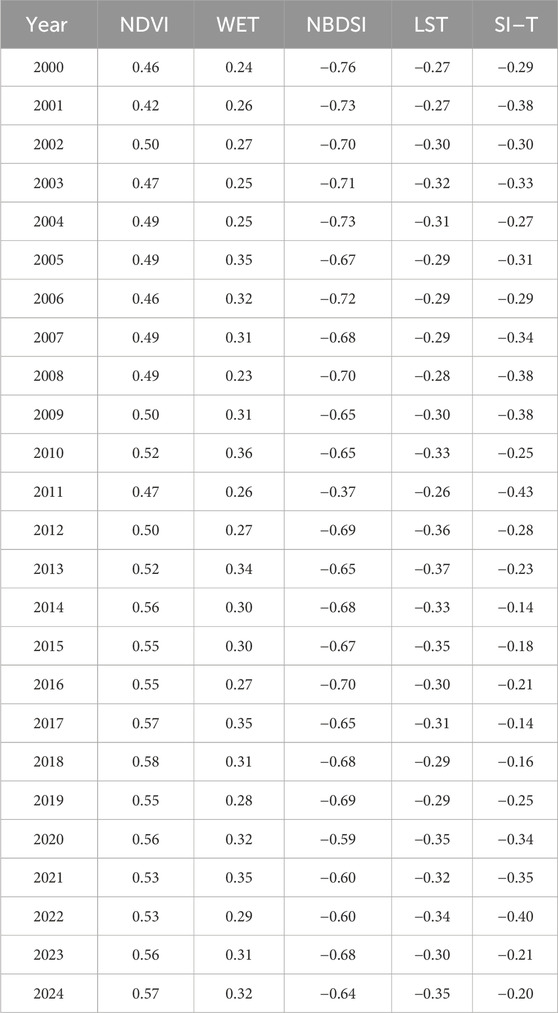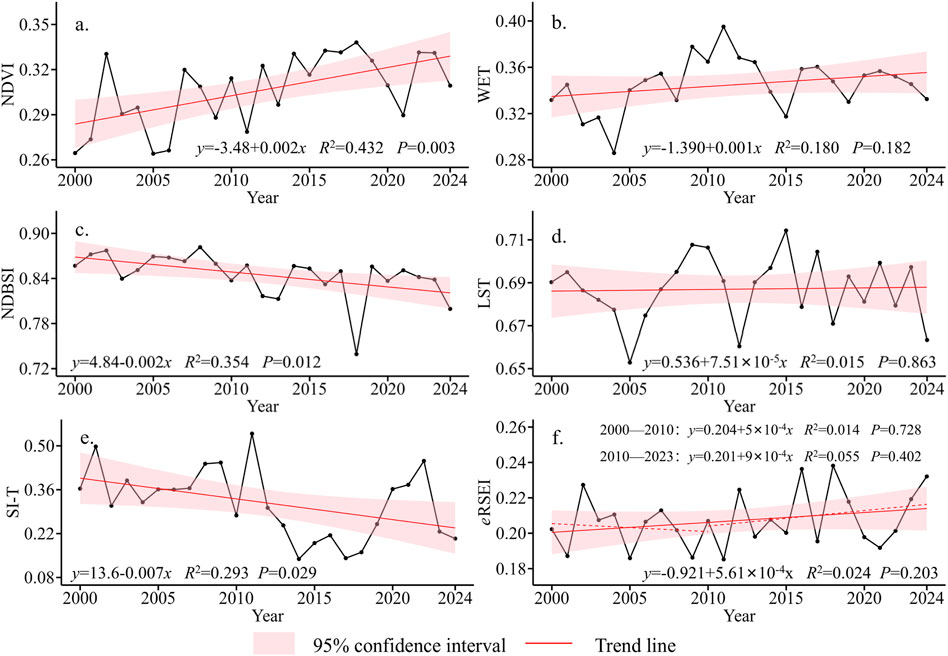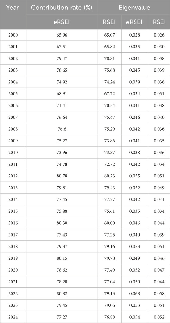 This study’s findings indicate that eRSEI in the study area has generally increased from 2000 to 2024, reflecting an overall improvement in EEQ. This outcome is consistent with previous regional studies (Li S. W. et al., 2024; Zhang L. Y. et al., 2025). Between 2000 and 2010, NDVI and WET values showed significant increases, while NDBSI and SI-T declined. These changes positively influenced eRSEI. However, the rapid increase in LST during this period imposed thermal stress that outweighed the positive effects of other indicators, leading to a temporary decline in eRSEI. After 2010, the continued increase in NDVI, together with the further reduction in NDBSI and SI-T, significantly enhanced the positive ecological effects. These combined improvements effectively offset local negative impacts from declining WET, thereby propelling the ecological environment into a stage of accelerated improvement. These findings also demonstrated that the variations in a single indicator may not fully reflect the true condition of the ecological system. Thus, integrated analysis of multiple indicators is essential to capture the complex, coupled dynamics of the ecological environment.