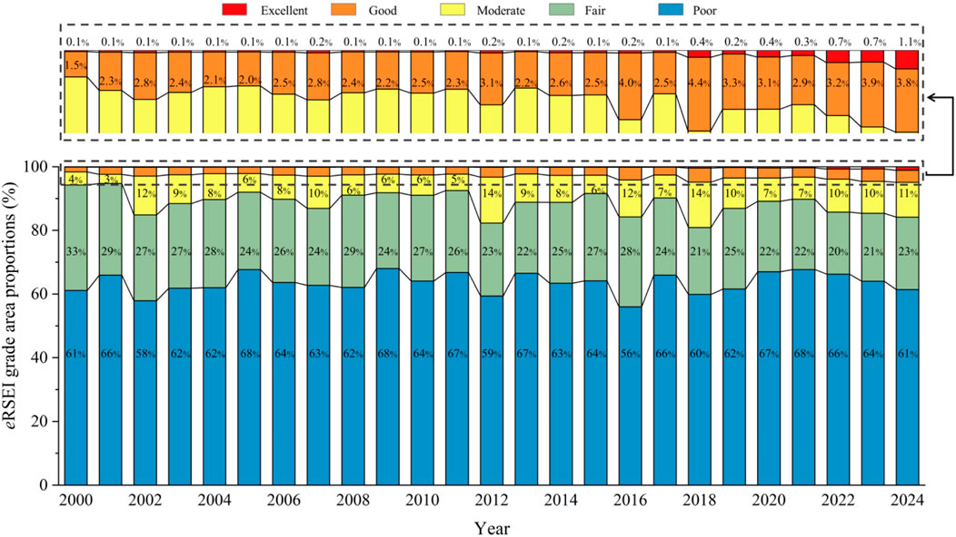 As shown in Figure 5, the statistical analysis of eRSEI grades from 2000 to 2024 indicates that the study area has been predominantly characterized by poor and fair grades, which together accounted for 81%–95% of the total area. Among these, the proportion of poor-grade areas remained relatively stable at approximately 63%. Fair-grade areas showed a marked decline, decreasing from 33% in 2000 to 23% in 2024, with a highly significant downward trend (P < 0.01). The proportion of moderate-grade areas fluctuated between 3% and 14%, displaying more variability than other grades, though they remained around 10% over the past 3 years. Good-grade areas exhibited the most pronounced expansion (P < 0.01), with a 2.5-fold increase in 2024 compared to 2000. Excellent-grade areas consistently represented the smallest proportion among all grades, remaining below 0.1% in more than half of the years. However, after 2018, a noticeable increase was observed, reaching 1.1% by 2024. Overall, the EEQ structure of the region exhibited a transitional pattern, characterized by a reduction in low-grade areas and expansion of moderate to high-grade areas, indicating a general improvement in EEQ of IMWSA.