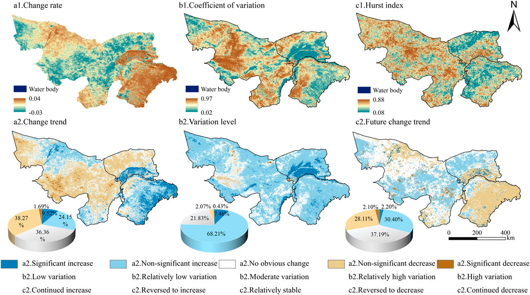 Figure 6. Trend variation of eRSEI in IMWSA from 2000 to 2024. a1. Change rate, a2. Change trend, b1. Coefficient of variation, b2. Variation level, c1. Hurst index, c2. Future change trend.