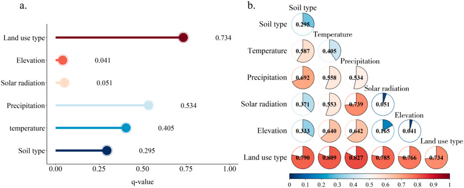 Figure 7. Results of q-values and interaction detection for each driving factor in IMWSA. (a) The q-values of driving factors influencing eRSEI’s spatial pattern, (b) Results of interaction detection among driving factors affecting the spatial distribution of eRSEI.