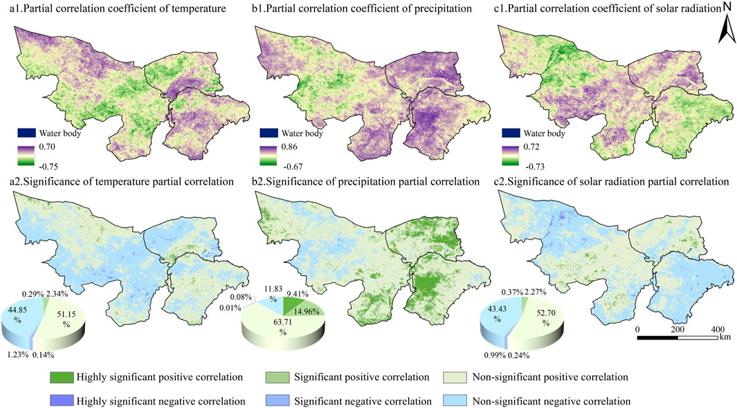 Figure 8. Partial correlations results between eRSEI and meteorological factors in IMWSA, with statistical significance testing. a1. Partial correlation coefficient of temperature, a2. Significance of temperature partial correlation, b1. Partial correlation coefficient of precipitation, b2. Significance of precipitation partial correlation, c1. Partial correlation coefficient of solar radiation, c2. Significance of solar radiation partial correlation.