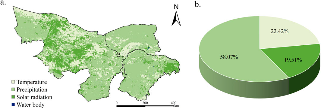Figure 9. Distribution and proportion of dominant meteorological factors influencing eRSEI variation in IMWSA. (a) Distribution of dominant meteorological factors, (b) Proportion of dominant meteorological factors.