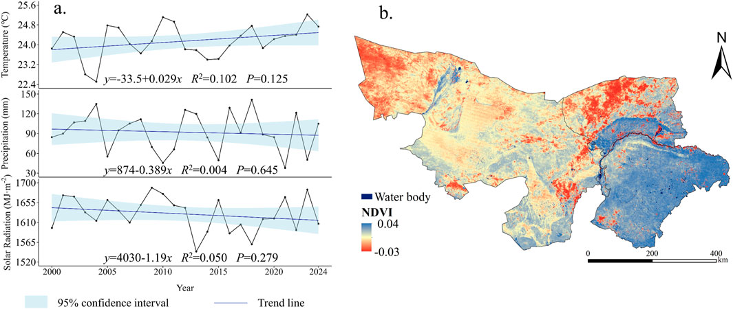 Figure 10. Variation in the driving factors of eRSEI in IMWSA from 2000 to 2024. (a) Variation in meteorological factors, (b) Variation in NDVI values.