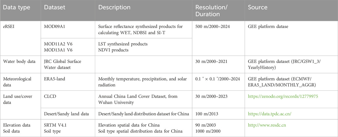 MODIS remote sensing imagery (June–August 2000–2024) was obtained from the GEE platform. After cloud removal, regional clipping, and water body masking based on the JRC Global Surface Water History dataset, the (e)RSEI for the study area was generated using mean composite synthesis. Meteorological variables for the same period were obtained from the ERA5-Land reanalysis dataset provided by the European Centre for Medium-Range Weather Forecasts (ECMWF). Soil type and digital elevation model (DEM) data were acquired from the Resource and Environmental Science Data Center, Chinese Academy of Sciences, while the land use data were obtained from the China Land Cover Dataset (CLCD). Spatial distribution data for deserts and sandy lands were collected from the National Tibetan Plateau Data Center. All raster datasets were resampled to a uniform spatial resolution of 500 m and projected to the WGS_1984_UTM_Zone_49N coordinate system. The detailed specifications of the datasets are listed in Table 1.