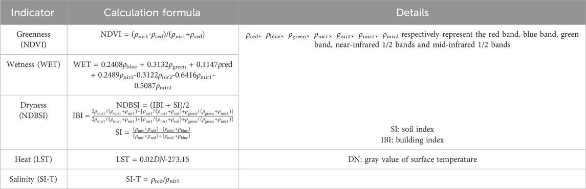 Soil salinization is a widespread form of land degradation in arid and semi-arid regions (Kumar et al., 2024). This phenomenon not only inhibits vegetation growth and accelerates land degradation, but also undermines desertification control efforts, triggers secondary degradation, and threatens agricultural production and infrastructure. (Yin et al., 2022; Sahbeni et al., 2023). Therefore, the degree of soil salinization should be incorporated as a key indicator in assessing the EEQ of IMWSA. Previous studies have shown that in semi-arid and arid regions, the Salinity Index-Transformed (SI-T) has the highest correlation with soil salt content and is more applicable to sparsely vegetated lands (Allbed et al., 2014; Wang et al., 2019). Therefore, this study incorporates SI-T as a salinity index into the classic RSEI model to more comprehensively characterize the impact of soil salinization on EEQ and enhance the sensitivity of RSEI to ecological changes in the study area. Table 2 outlines the equations for computing the various indicators (Ye et al., 2025; Zhang et al., 2024c).