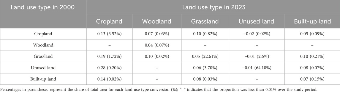 Land use change serves as a direct reflection of both the direction and intensity of human activities in modifying the natural environment. As shown in Table 5, land use changes in IMWSA from 2000 to 2023 accounted for 9.54% of the total area. The proportions of grassland converted into other land types and converted from other land types were nearly balanced, both around 4.55%. Cropland experienced a 0.96% area loss but gained 1.93% through conversion, leading to a net increase of about 0.97%. Unused land decreased, as 3.97% was converted to other uses while only 2.63% was gained through conversion. Although the areas of woodland and built-up land showed an overall increasing trend, their spatial proportions remained relatively low within the study area.