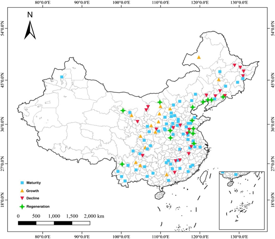 In 2013, SDPRC was released, as a programmatic document for the transformation of RBCs in China during the 13th Five-Year Plan period. SDPRC identifies Chinese RBCs and provides a more specific definition: RBCs are cities that focus on the development, processing, and utilization of minerals, forests and other resources in the region. By the current situation of the resource stocks and utilization situation, the State Council finally identified 262 RBCs, including large and medium-sized cities, and defined them into four categories: Maturity (54%),Growth (12%), Decline (25%), and Regeneration (9%) (He et al., 2017). Figure 1 illustrates the geographical distribution of the four types of resource-based cities across China.