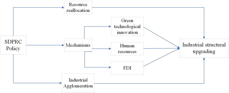 In summary, previous policy research on RBCs involved aspects such as economy, environment, and energy efficiency, but remain some limitations. In the study of the policy effect on industrial structure of RBCs, previous study put focus on the resource depleted cities, without involving the evaluation of different types of RBCs. Furthermore, the existing research on SDPRC has an early data scale, and there is also insufficient exploration of the transformation mechanism. Using the latest data, our study examines how SDPRC facilitates industrial restructuring in RBCs. In the meanwhile, we integrate three mechanisms—green technological innovation, human capital, and FDI—into a unified analytical framework to examine whether they play a facilitative role in the process through which SDPRC promote industrial structural upgrading. We comprehensively exaimne the roles of the supply side (green technological innovation), factor market (human resources), and capital investment (FDI) in the transition of RBCs, thereby broadening the mechanisms and providing concrete pathways for future urban sustainable development.