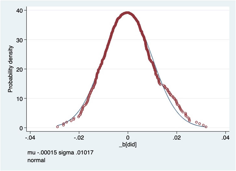 To further verify the reliability of the baseline regression results, this paper employs a placebo test to mitigate potential confounding effects from unobservable factors. Specifically, we construct a fictional treatment timing and generate artificial treatment groups to construct a placebo treatment variable, then re-run the regression estimation. If the placebo treatment variable shows no statistically significant impact on the outcome variable, it suggests that the baseline results are more likely to reflect the actual policy effect rather than being driven by other unobserved confounding factors.