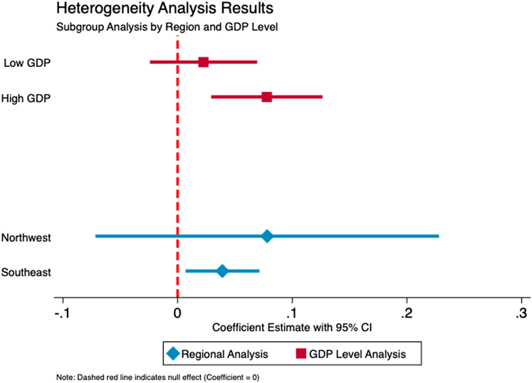 According to Zheng and You (2023), We divided the sample into two groups based on the annual median per capita GDP: a high per capita GDP group and a low per capita GDP group. From the regression results in Table 7, it can be observed that the effect of SDPRC on the industrial structure upgrading of RBCs is significant in the high per capita GDP group, with a coefficient of 0.078, significant at the 1% level. However, it is not significant in the low per capita GDP group. This may be because areas with higher per capita GDP not only exhibit a more advanced level of economic development, but also possess greater technological innovation capacity, better infrastructure, and a larger pool of highly skilled technical talent. As a result, policy interventions are likely to yield stronger effects in these regions. To better visualize the heterogeneity, we created Figure 5 using a forest plot.