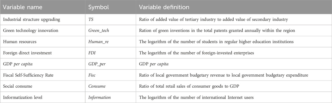 Based on existing studies on determinants of industrial structure upgrading, we control some variables in our regression models. First, we control the economic status of cities and GDP per capita. Second, we control the local information level, measured by the ratio of postal and telecommunication services per capita to GDP per capita. Third, the employment rate is measured by the people employed in the household population. Last, the education level is measured by the share of the government’s investment in education to GDP. Table 1 provides definitions of all the variables and Table 2 provides their descriptive statistics.