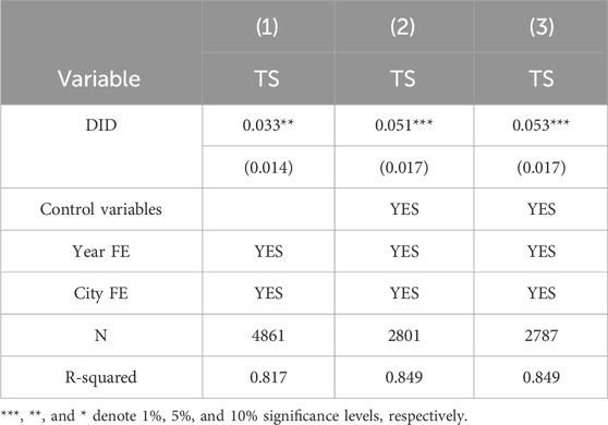 Based on the baseline model (1), the impact of the SDPRC on industrial structure upgrading is in Table 3, columns (1) and (2). In column (1), the regression contains city and year-fixed effects, not including the control variables. It shows that the coefficient