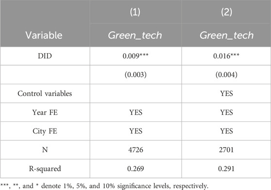 The regression results of green technological innovation, Equation 3, are shown in Table 4, column (1) and (2). When no control variables were added, the regression coefficient was 0.009, significant at the 1% level. After adding control variables, the regression coefficient was 0.016, significant at the 1% level. This means that the introduction of SDPRC promotes green technological innovation in RBCs.