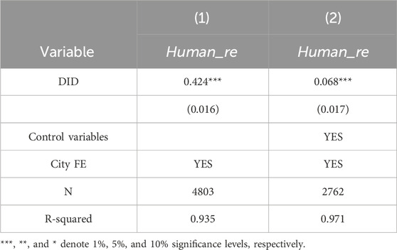 The regression results of human capital, Equation 4, are shown in columns (1) and (2) of Table 5. When no control variables were added, the regression coefficient was 0.424, significant at the 1% level. After adding control variables, the regression coefficient was 0.068, significant at the 1% level. The introduction of SDPRC has a significant positive effect on the human capital level of RBCs. One of the key points for industrial structure upgrading of RBCs in the SDPRC is also to develop the tertiary industry dominated by the service industry. Therefore, human capital should be an important factor in the transformation process of RBCs. The series of measures in the plan also demonstrates the importance and attraction of talent in RBCs. Firstly, SDPRC encourages the establishment of diversified industries, the development of modern service industries, and new industries, which can provide more high-level employment opportunities. Secondly, SDPRC mentions strengthening the construction of talent teams in RBCs. Improve the labor competence of production personnel through vocational education and on-the-job training. At the same time, through key enterprises and research projects, as well as higher education institutions, RBCs can guide and cultivate innovative talents. In the meanwhile, set up entrepreneurship platforms to attract overseas students to return to resource-based cities for entrepreneurship. Thirdly, as to the environment, there are specific annual targets for reducing environmental pollution in the SDPRC. The reduction of environmental pollution in RBCS can improve the living environment. In addition, improving people’s livelihoods is also one of the three main evaluation indicators of the SDPRC. The growth rate of residents’ disposable income should be higher than the national average, with an average annual growth rate of 8%; The establishment of a basic public service system and the continuous improvement of social security levels for elderly care, medical care, work-related injuries, and unemployment, these have all enhanced the attractiveness of RBCs to talents.