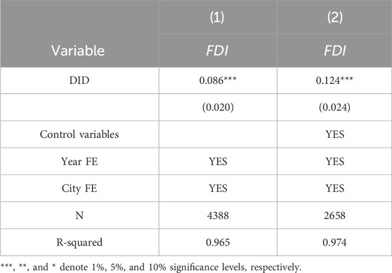 The essential assumption of employing DID analysis is the parallel trend. It assumes that the treatment group and the control group would have had a similar trend if the treatment had not been. Thus, after the treatment, the difference between the treatment group and the control group can be attributed to the implementation of the treatment. At the same time, the DID method also needs to meet the policy homogeneity, that is, individuals should not form effective expectations before policy implementation. To avoid multicollinearity issues, the sample year before the policy implementation was removed. The dummy variable for non-pilot cities is 0. The equation is as follows: