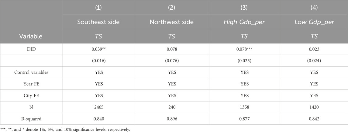 The hererogeneity regression results in Table 7 show that the policy effect of SDPRC on RBCs is significant at the southeast side of Hu Huanyong Line. The coefficient is 0.039, significant at 5% level. On the other hand, the policy effect is not significant at the northwest side of Hu Huanyong Line. The industrial structure upgrading requires not only policy support from the government but also the backing of various local factors such as economic conditions, talent pool, and capital flow. These elements are well-present in the densely populated and economically concentrated southeastern region of China, whereas they remain relatively weak in the northwestern region. Additionally, transportation infrastructure in the northwest is less developed compared to that in the northeast. In this study, the indicator for industrial structure upgrading is measured by the ratio of the value-added of the tertiary industry to that of the secondary industry. Given that the tertiary industry relies more heavily on market size and population scale, this may explain why the regression results are statistically significant in the southeastern region but not in the northwestern region.