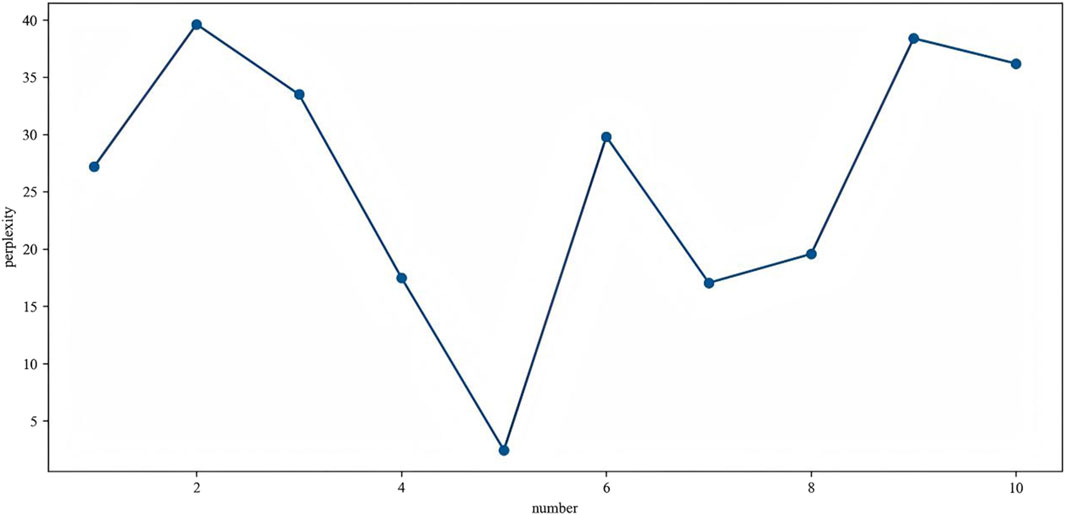 Specifically, LDA modeling was implemented using Python with the Gibbs sampling method. The LDA Model and Coherence Model from the gensim library were imported. The hyperparameters α and β of LDA were set to 50/k and 0.1, respectively, with the number of iterations set to 1,000. Through multiple experiments, the perplexity and coherence of the model were calculated for different numbers of topics. Curves illustrating the changes in perplexity and coherence with the number of issues (ranging from 1 to 10) are presented in Figures 2, 3, respectively.
