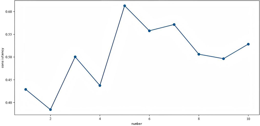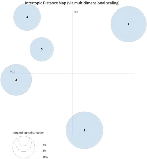 The trend of the curves indicates that as the number of topics increases, perplexity initially decreases and then increases, reaching its lowest value at 5 topics. This suggests that the model’s fitting ability to the documents is optimal with 5 topics. Meanwhile, coherence increases first and then decreases, peaking at 5 topics. Considering both perplexity and coherence metrics comprehensively, the optimal number of topics is determined to be 5.