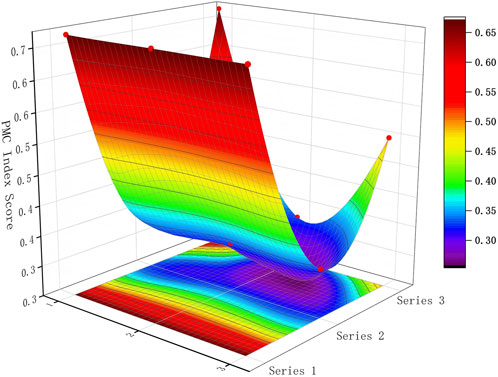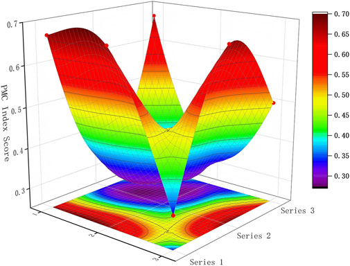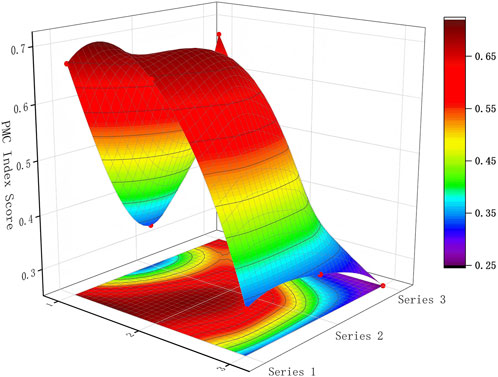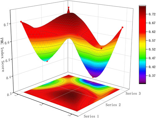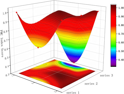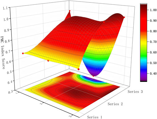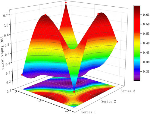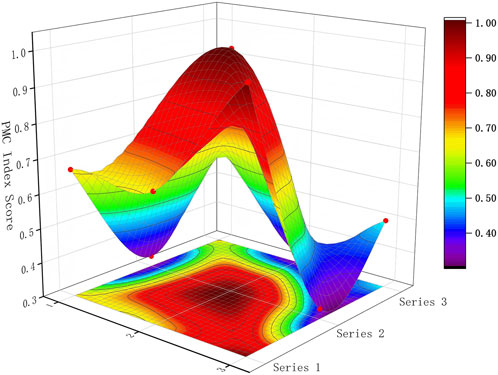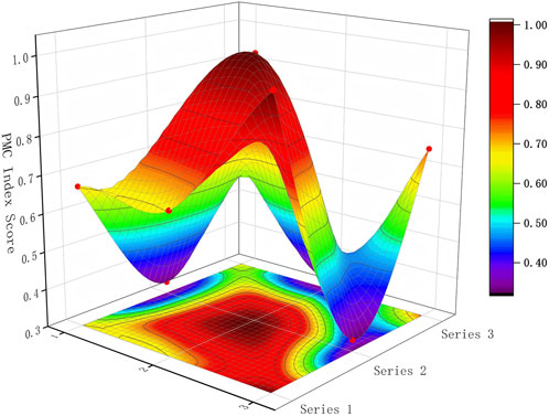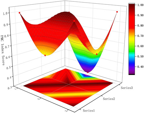 To enhance the overall visualization effect of the PMC matrix, this study generates surface plots of the sample policies using formula 5. Through surface plots, we can intuitively present data attributes or variables from different dimensions, thereby providing a more comprehensive view of the characteristics of the objects represented by the data. A convex surface indicates that the overall content of the policy is relatively complete, while an obvious concave surface suggests that the policy has deficiencies in specific aspects. The PMC surface plots of each policy are shown in Figures 5–13, respectively. In the figures, (1, 2, 3) serves as the horizontal axis, and (Series 1, Series 2, Series 3) as the vertical axis. Therefore, (1, Series 1) represents Z1, (2, Series 1) represents Z2, (3, Series 1) represents Z3, and so on. Different shades of color scales distinguish different rating levels, and various degrees of convexity and concavity indicate different score magnitudes (convex parts represent high scores, while concave parts represent low scores).