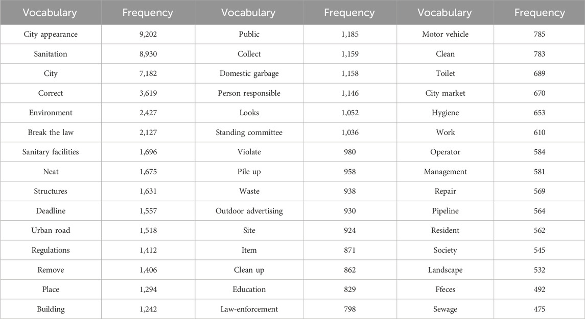 To further enhance segmentation accuracy before formal data processing, three preparatory steps were implemented. The first step was synonym merging, through which synonymous terms were consolidated to avoid redundancy in post-segmentation analysis. The second step involved developing a custom dictionary and stopword list. A domain-specific custom dictionary and stop-word list were constructed, iteratively refined, and validated based on the semantic and lexical characteristics of urban appearance and environmental sanitation policy texts, until their content was finalized. The third step involved integrating a professional domain dictionary, a specialized dictionary for the urban appearance and environmental sanitation field, which contains domain-specific terms such as “waste classification,” “sanitation facilities,” and “dust pollution.” This dictionary was integrated into the segmentation workflow. Preloading these terms into Jieba’s dictionary ensured they were recognized as intact lexical units during segmentation, preventing incorrect splitting of domain-critical terminology.