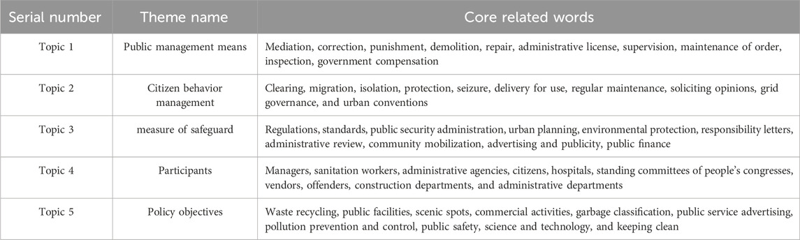 Topic 3 is associated with supporting measures, featuring keywords such as “regulations,” “quality standards,” “public security management,” and “urban planning,” which reflect the proactive design by policymakers to ensure effective policy implementation. These supporting measures can be divided by their functional levels into institutional, normative, and executive guarantees. Institutional guarantees include regulations, rules, and management methods, providing a solid institutional foundation for policy implementation; normative guarantees encompass quality standards, technical specifications, and operational procedures, ensuring policy execution follows clear guidelines; executive guarantees involve public security management, supervision, and inspection, and urban planning, offering specific operational support for policy implementation. Therefore, organically combining these three supporting measures can lay a solid foundation for the smooth implementation of urban appearance and environmental sanitation policies and ensure the realization of policy goals.