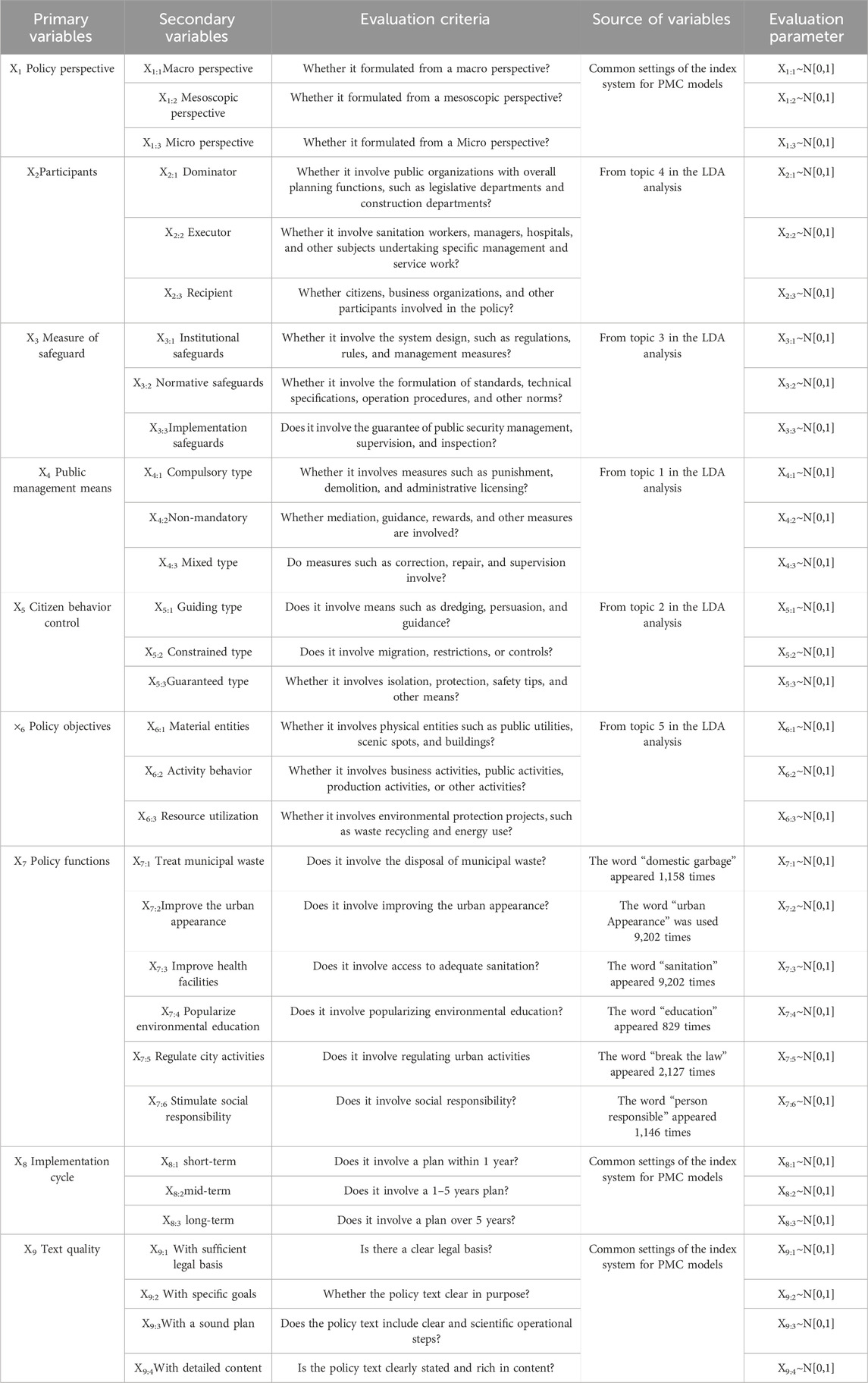 Against this contextual backdrop, the present study employs an integrated Latent Dirichlet Allocation-Policy Modeling Consistency (LDA-PMC) methodology to undertake an in-depth investigation of China’s urban appearance and environmental sanitation policies. LDA, a sophisticated topic modeling technique, facilitates the automatic extraction of latent thematic constructs from large-scale text corpora (Blei et al., 2003). Applying LDA to policy documents enables the identification of core thematic domains—such as waste management systems, pollution remediation strategies, and urban greening initiatives—which subsequently serve as foundational variables for the PMC index evaluation framework. The PMC approach, a structured policy modeling tool (Gong et al., 2025), facilitates the visual analysis of policy components, including objectives, operational measures, and stakeholder engagement. The integration of LDA and PMC fosters a comprehensive understanding of policy nuances and implementation mechanisms. LDA provides an empirical basis for variable identification and PMC framework construction, while PMC enhances the analytical reach of LDA through intuitive three-dimensional visualization.